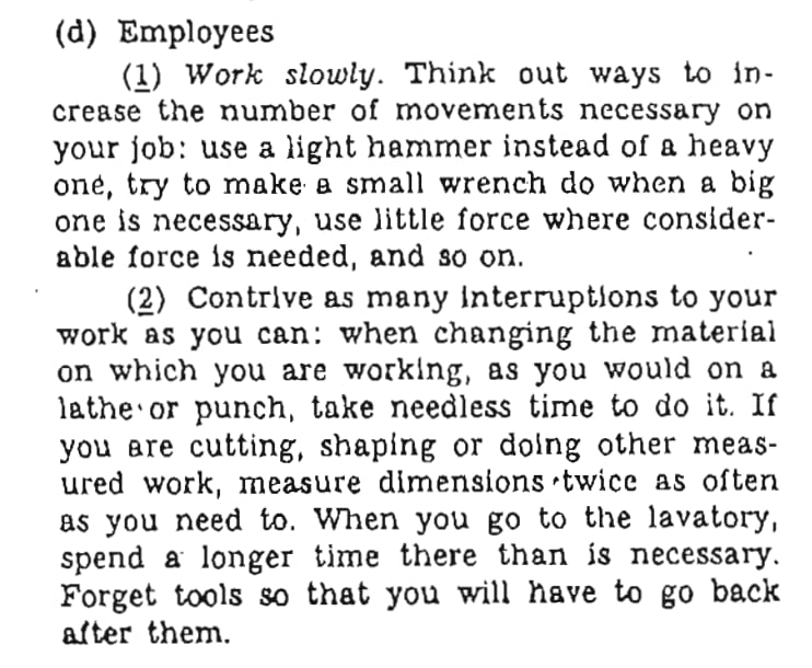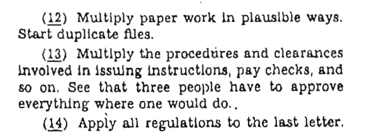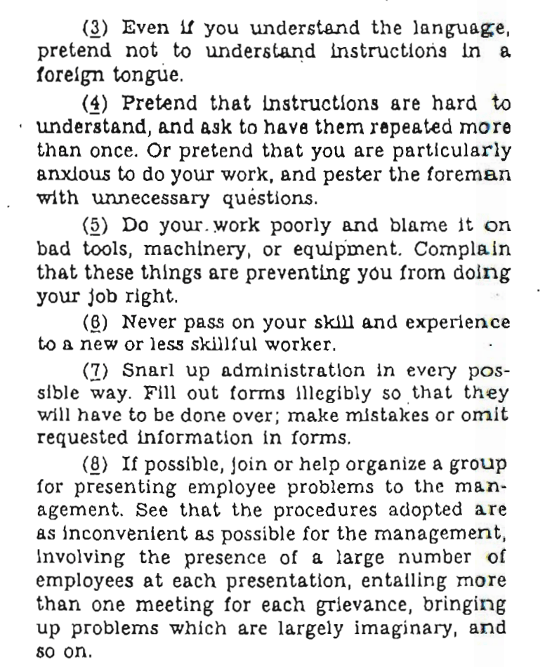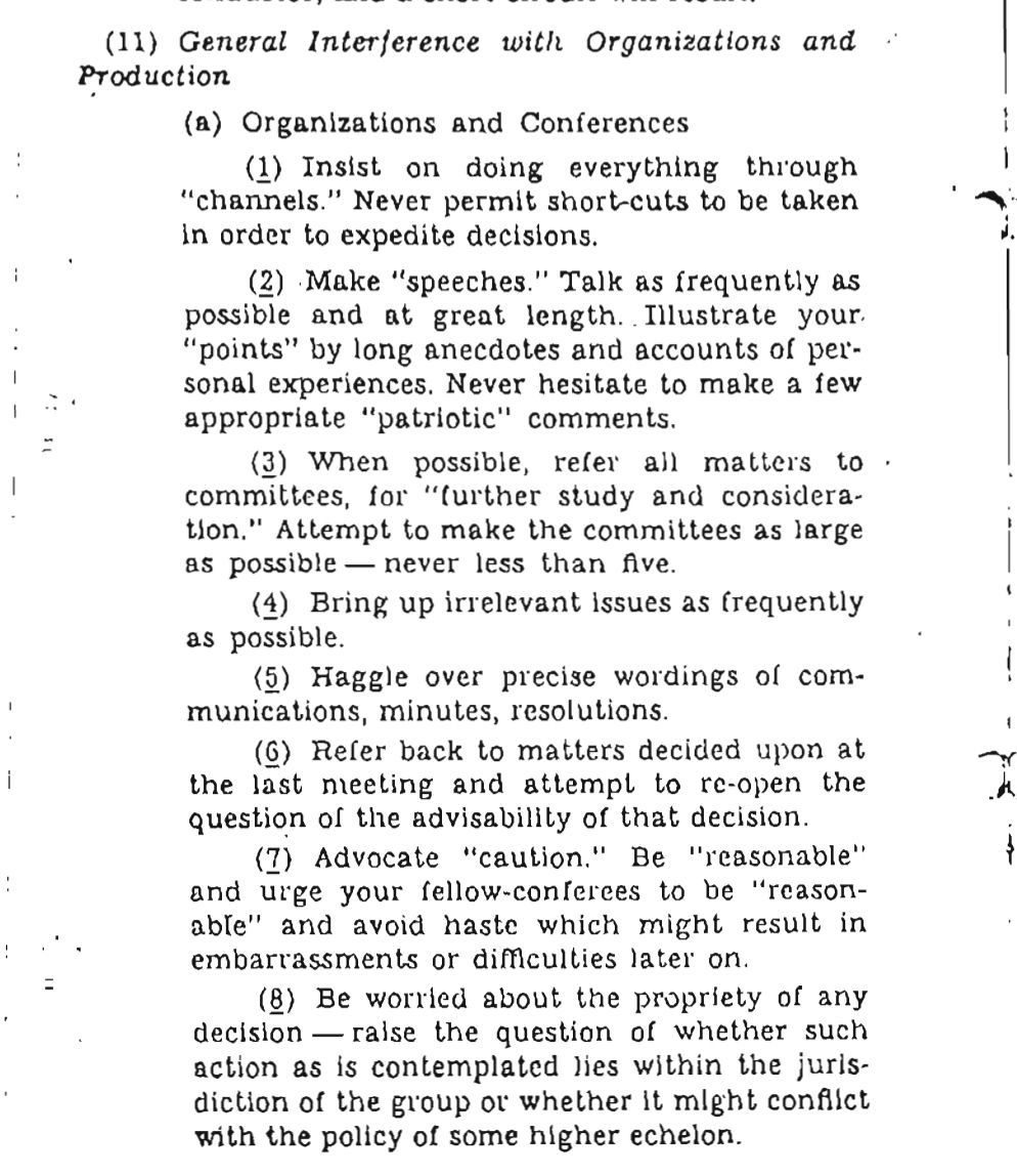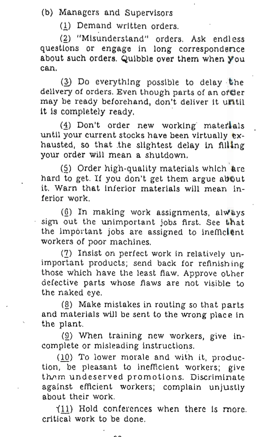 The declassified CIA Simple Sabotage Field Manual from 1944 explains how to sow dissent and kill productivity within an organisation. Turns out that the default state of a company is chaotic, and not that different from deliberate sabotage. Active managerial alignment and weeding out the timewasters is required at every stage.